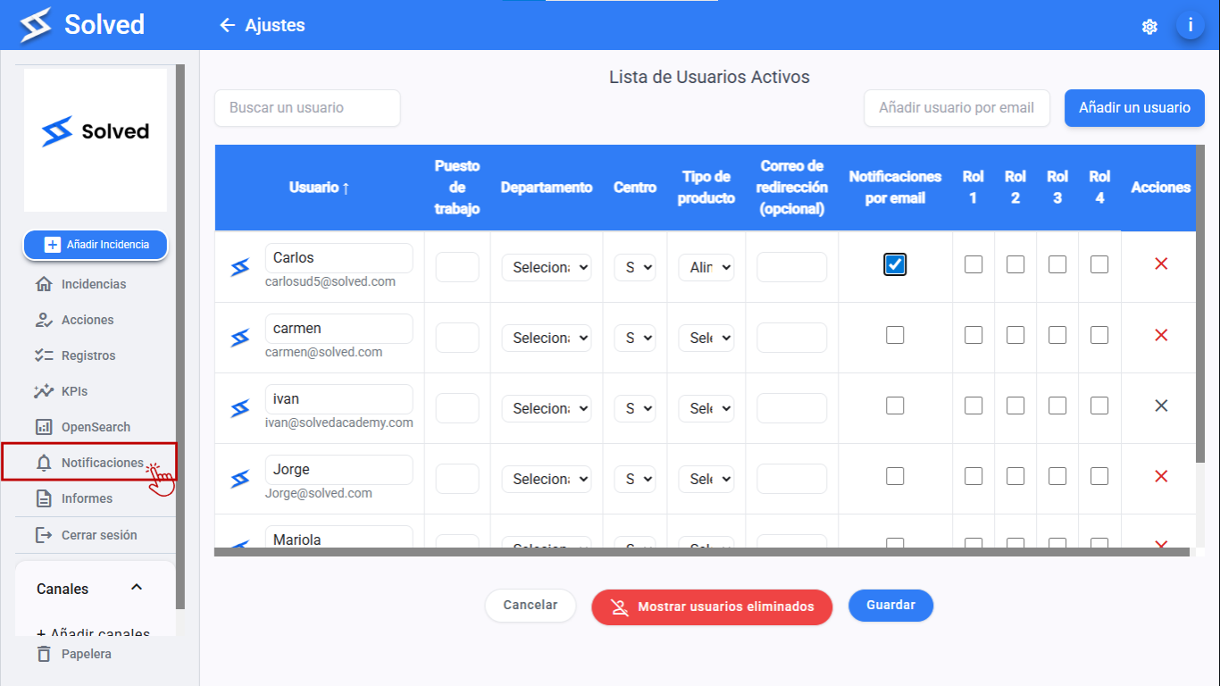 Otra manera de poder activar las notificaciones por email es desde “Gestión de usuarios” en “Ajustes”