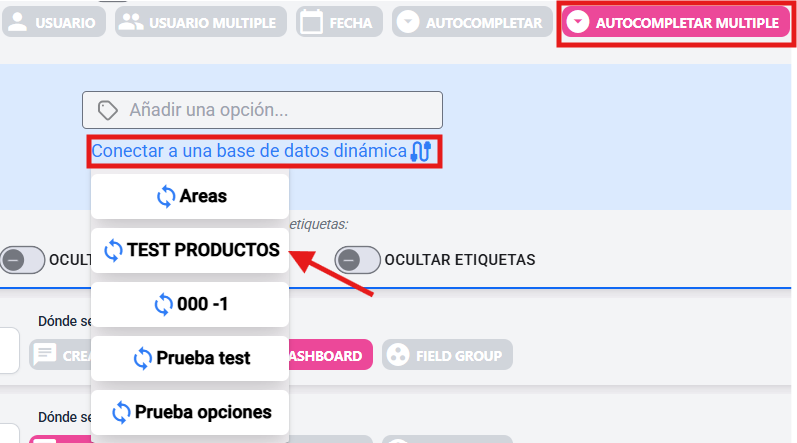 El campo debe de estar en modo “Autocompletar múltiple”. Selecciona una base de datos desde el botón “Conectar a una base de datos dinámica”