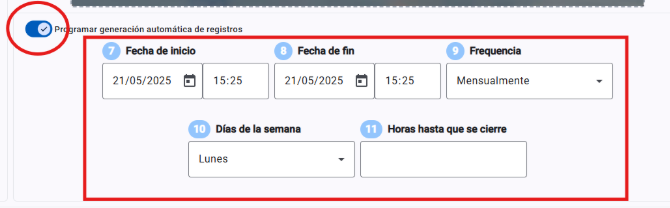 Fecha de finalización: Establece hasta cuándo quieres que se generen los registros (puede ser a años vista).
